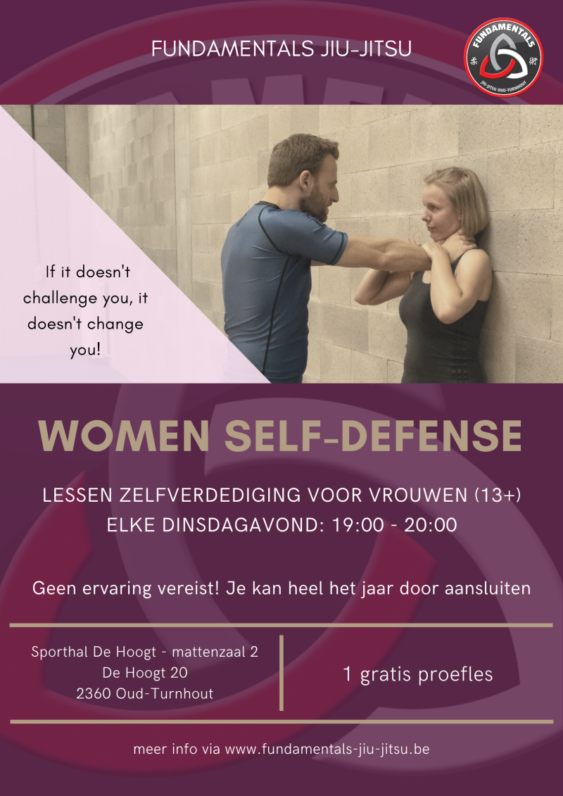 Momenteel zijn er geen speciale events gepland. Wel willen we onze lessen Women Self-Defense in de kijker blijven zetten omdat deze uniek zijn in de regio. De volgende lessenreeks start op 2 september 2025. Je kan het hele jaar door aansluiten. Heb je interesse, stuur dan even een mailtje naar info@fundamentals-jiu-jitsu.be of neem contact op via onze contactpagina. Je kan ook gewoon naar de les komen op dinsdagavond om 19u en direct meedoen. Iedereen krijgt 1 gratis proefles. Als je op de affiche hieronder klikt, kom je automatisch op de pagina van Women Self-Defense.